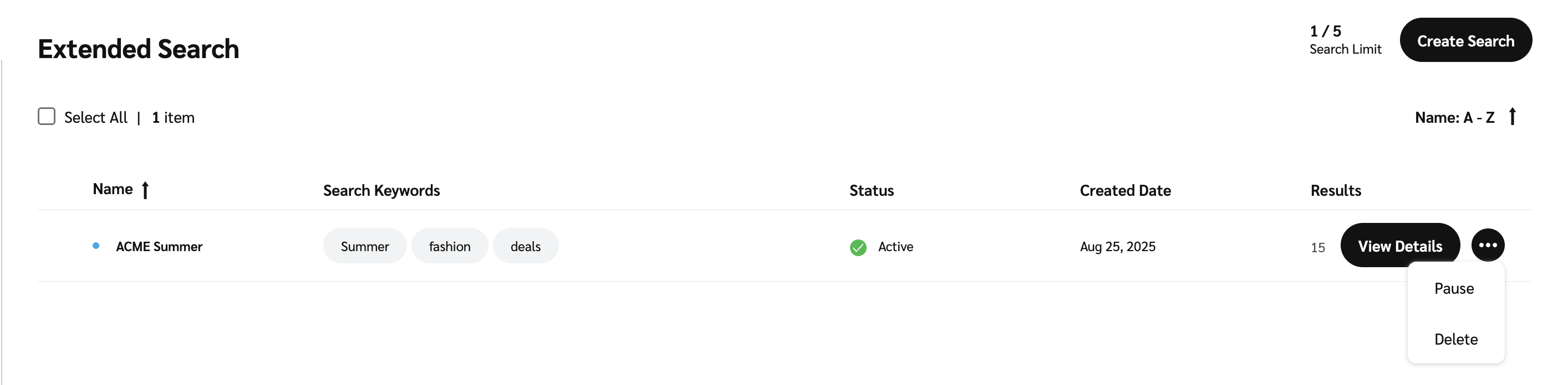 Vous pouvez avoir jusqu'à 5 recherches étendues actives. Si vous souhaitez lancer des recherches supplémentaires, vous devez d'abord mettre en pause ou supprimer une recherche existante *actif* recherche étendue.