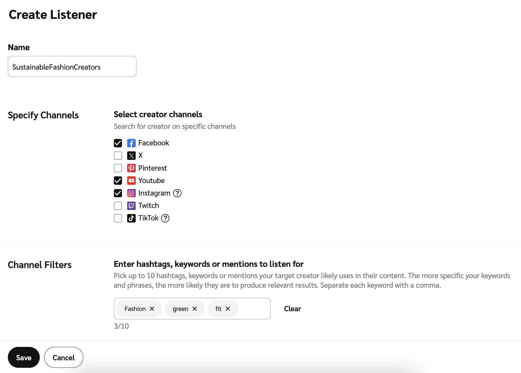 4. Dans la section *Spécifier les canaux* section, utilisez les ![](https://57104473-files.gitbook.io/~/files/v0/b/gitbook-x-prod.appspot.com/o/spaces%2FwMLlMoFBtKJa8ptd3zaw%2Fuploads%2Fgit-blob-d2954616dc486c3e12c9211e20ff376bda0ab1af%2F7586e04e82e7c7203e5c82320dd417f8ac564cae5035024fdf0eb2ed017e6376.svg?alt=media) **\[Cases cochées]** pour préciser les canaux sociaux sur lesquels vous souhaitez rechercher du contenu de créateurs.