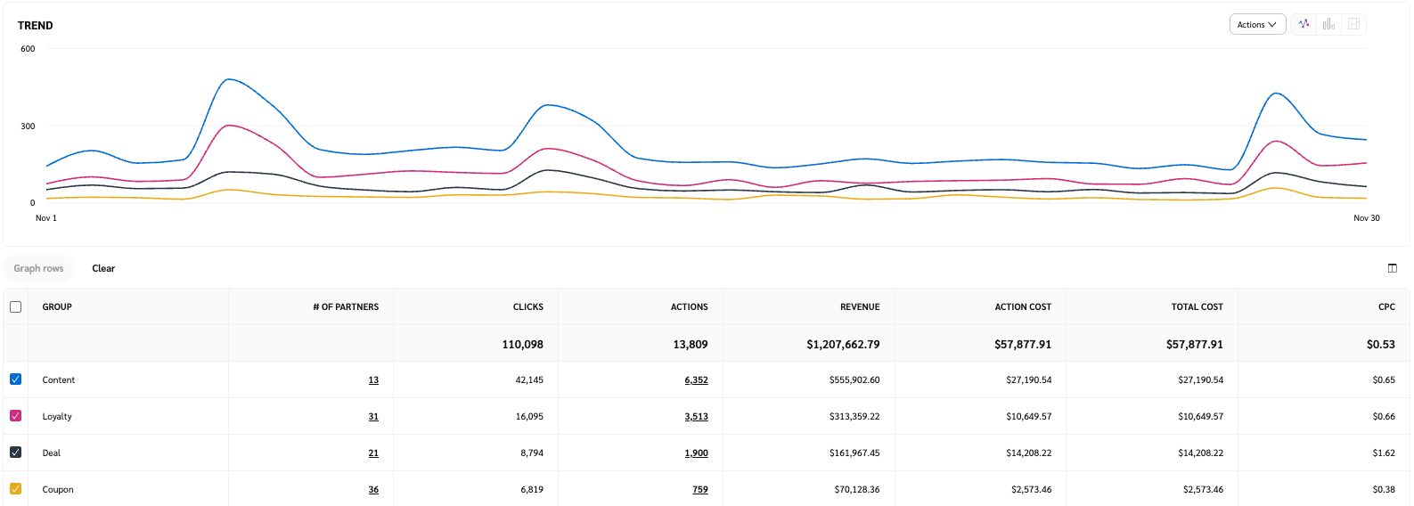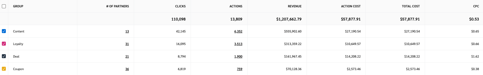 Le *Performance par groupe de partenaires* le rapport vous montre un large éventail de données de performance ventilées par groupes de partenaires. Les KPI, tels que les clics, les actions, les revenus et plus encore, s'y trouvent tous.