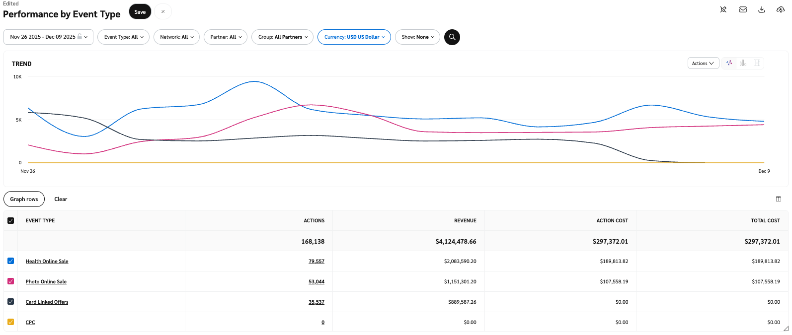 その *イベント種別別のパフォーマンス* レポートは、オンライン販売やリード送信など、プログラム内で追跡するイベントに関する特定のデータを表示します。
