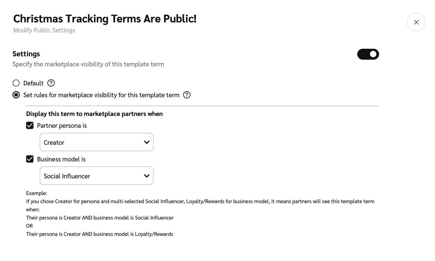 Add targeted public-facing terms: This allows you to define additional public-facing terms in addition to the default public terms. You can set specific rules (like partner persona or business model) so that targeted partners on the marketplace see these more favorable terms instead of the default template terms.