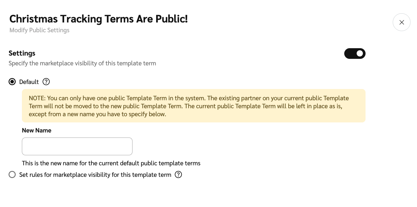 Set a new default public term: This replaces your existing default public term. The selected terms become the one general public offering visible to partners on the marketplace, unless other rules apply. Your old default public terms will no longer be the default public offering. The terms themselves (and the partners signed to them) remain the same.