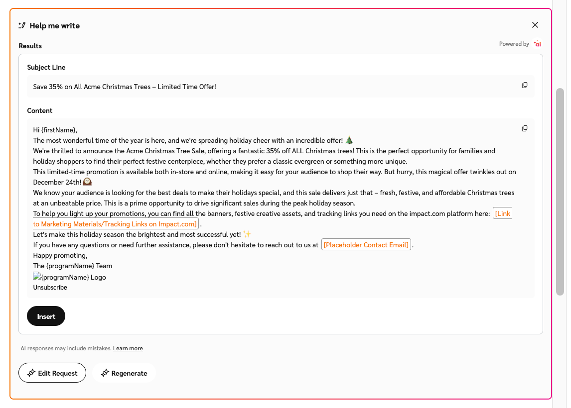 Using the impact ai feature in your newsletter allows you to automatically create and send personalized email content to your partners. Leverage AI to generate engaging content about program updates, upcoming changes, special promotions, and more. This helps you save time while delivering consistent, high-quality communication at scale.