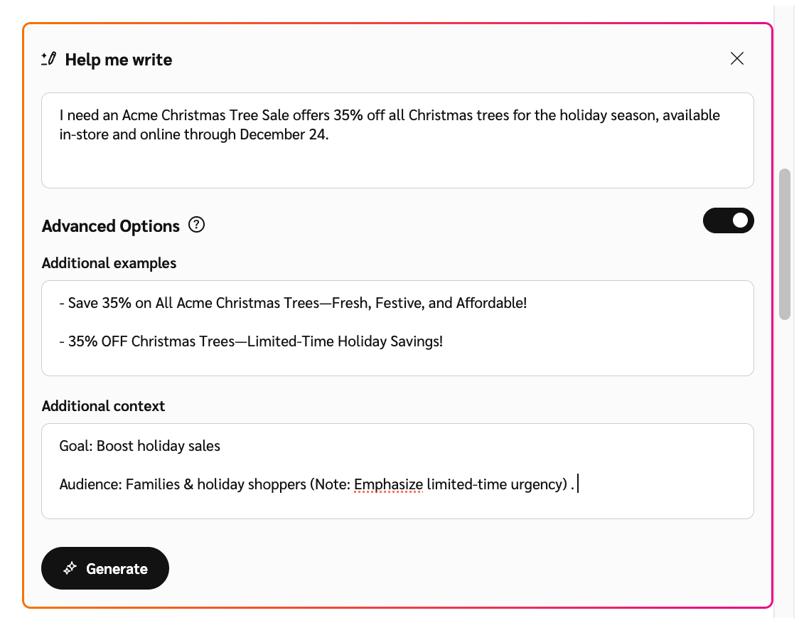 Select Generate, to create the subject line and content based on your inputs.
