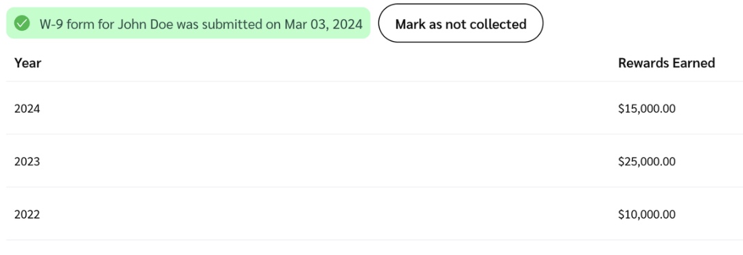 Selecione **Marcar como coletado** quando um participante enviar o W-9. Isso remove o limite de recompensa de US$ 2.000 e libera quaisquer recompensas pendentes.