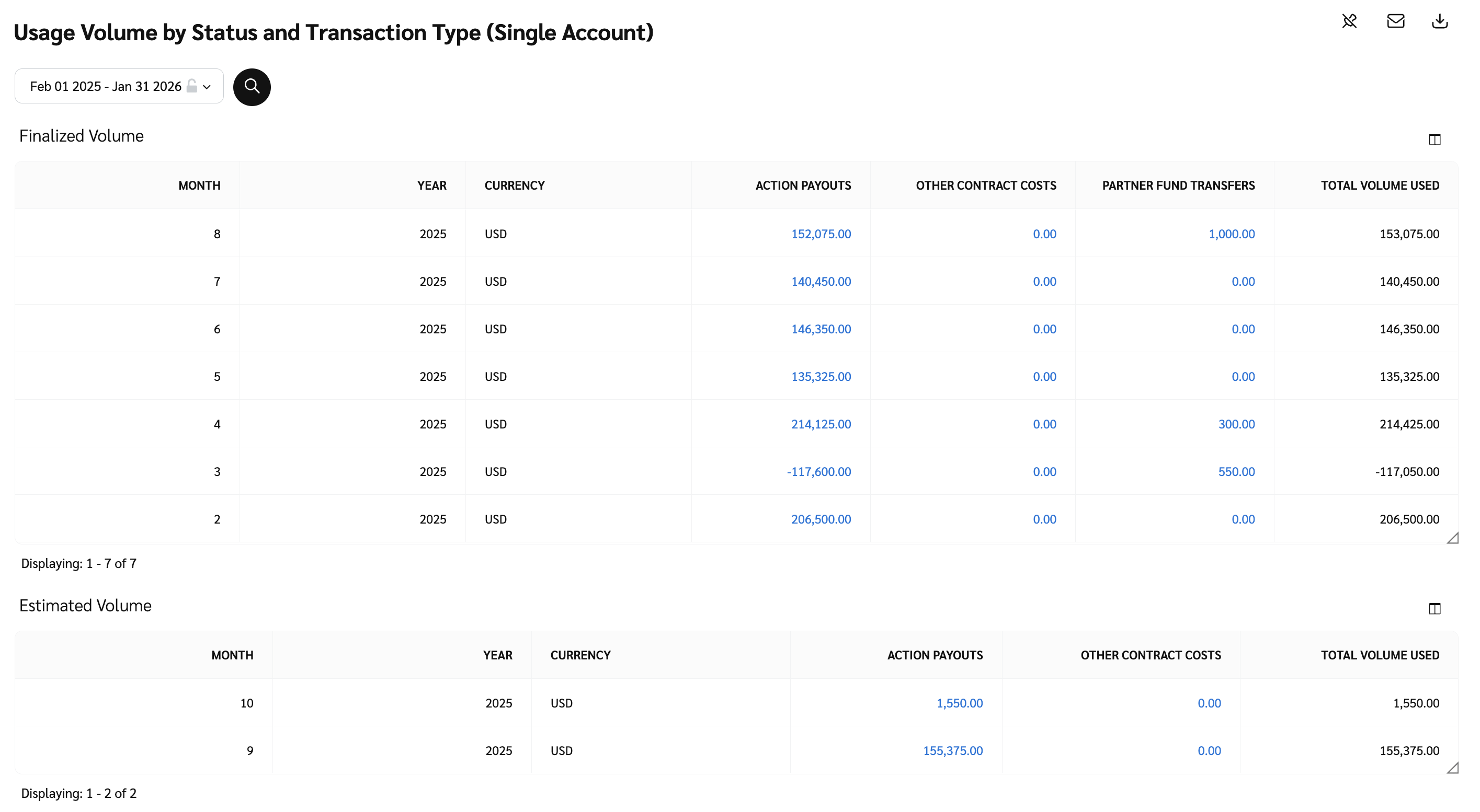 该 *按状态和交易类型的使用量* 报告允许您跟踪使用情况，包括操作成本、合作伙伴资金转移以及任何其他类型的合作伙伴佣金或奖金。此报告提供了有关使用金额如何确定的更好洞察，并在费用计入账单之前预见未来可能征收的使用费用。