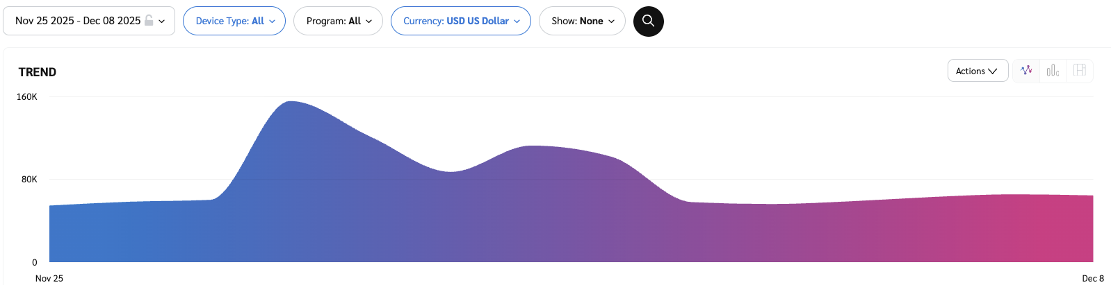 El gráfico de tendencias le permite filtrar su informe según el grupo central de métricas que genera el mayor valor. Esta vista proporciona las tendencias diarias de la métrica seleccionada durante un rango de fechas específico.