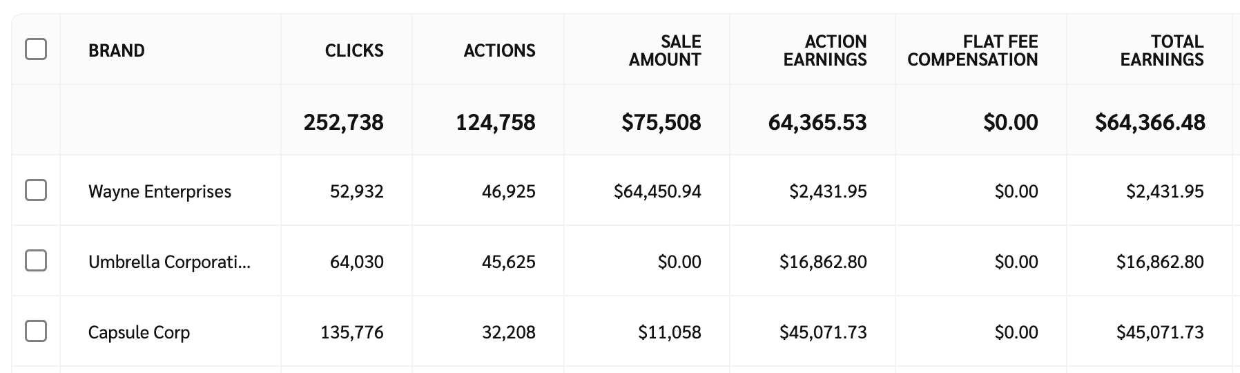 Le rapport Performance par marque vous montre un large éventail de données de suivi ventilées selon les publications sociales de chaque créateur pour une marque spécifique. Des indicateurs clés, comme les actions, les clics et plus encore, peuvent tous être trouvés ici.