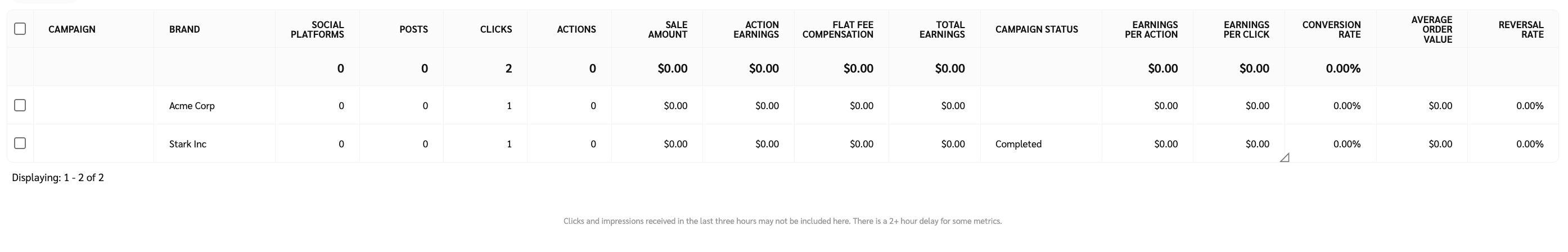 Le *Performance par campagne* le rapport vous montre une large gamme de données de suivi ventilées par campagne. Les indicateurs clés de performance, comme les actions, les clics et plus encore, se trouvent tous ici.