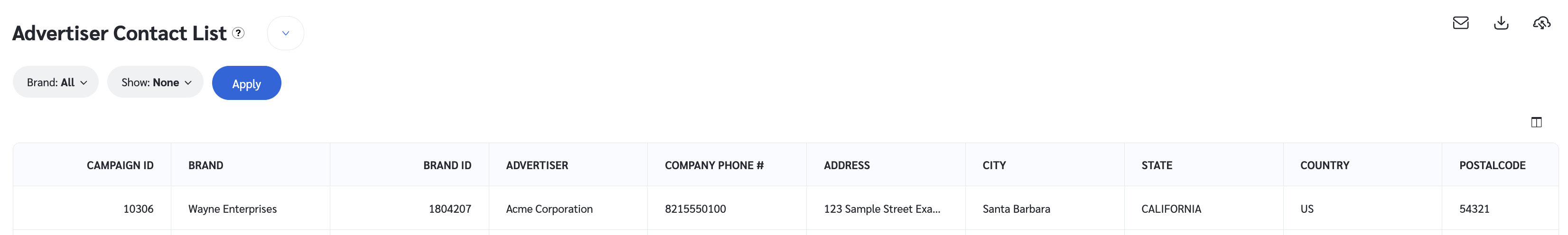 3. Sélectionnez **rapport Liste de contacts des annonceurs** pour afficher les coordonnées de la marque.