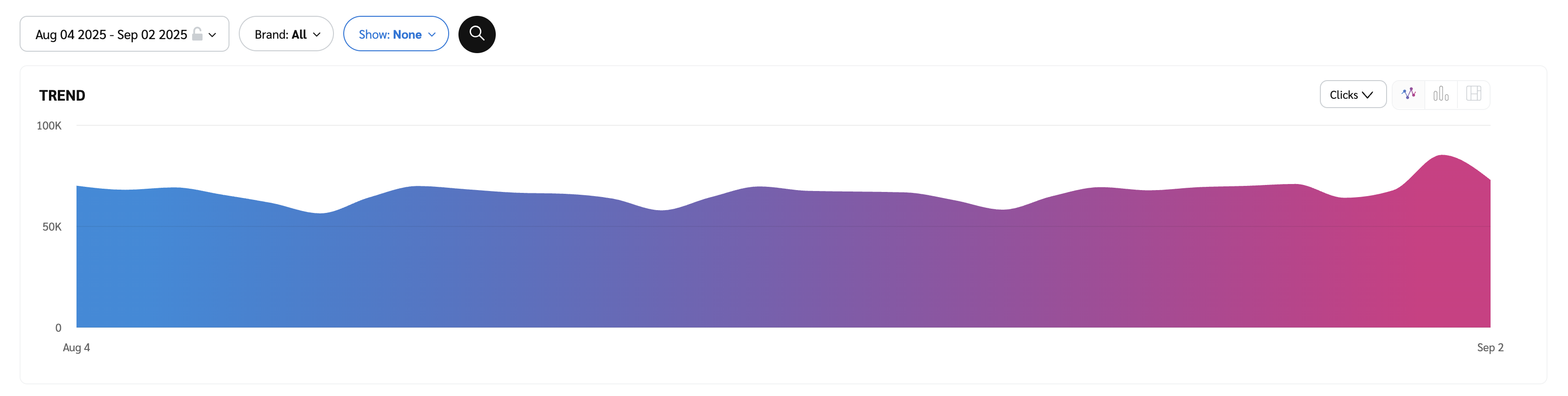 トレンドグラフでは、最も価値の高い主要な指標グループに従ってレポートをフィルタリングできます。この表示は、選択した指標の特定の日付範囲における日次トレンドを示します。
