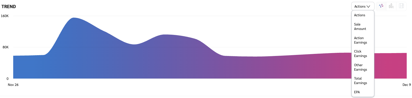トレンドグラフでは、最も価値の高いコア指標グループに基づいてレポートをフィルタリングできます。この表示は、選択した指標の特定の期間における日次のトレンドを提供します。