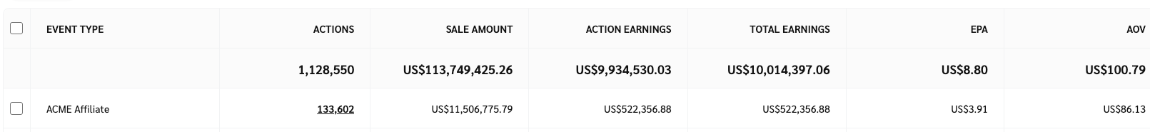 | このアクションに関連付けられたイベントタイプ。イベントタイプはアクションを発生させた際の支払い方法を決定します。 | リンククリックからパートナー先ブランドのために生み出した販売の合計金額です。                                                                                                  |