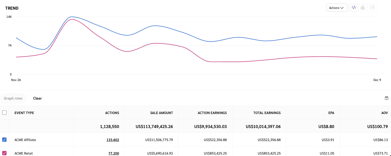 比較グラフは、トレンドグラフで選択した指標に基づいて、データテーブル内の選択行の *イベントタイプ* トレンドグラフで選択した指標に基づき、データテーブルの選択行の合計を示します。このグラフは、選択した日付範囲にわたる選択されたイベントタイプの日次トレンドを表示します。