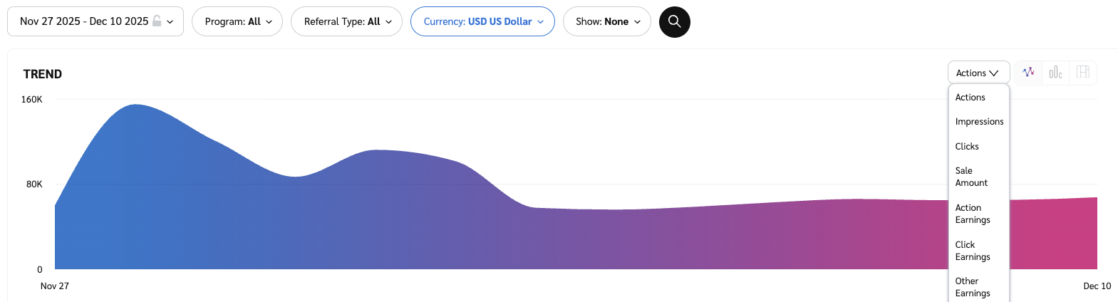 趋势图使您能够根据产生最高价值的核心指标组来筛选报告。此视图提供所选指标在特定日期范围内的日趋势。