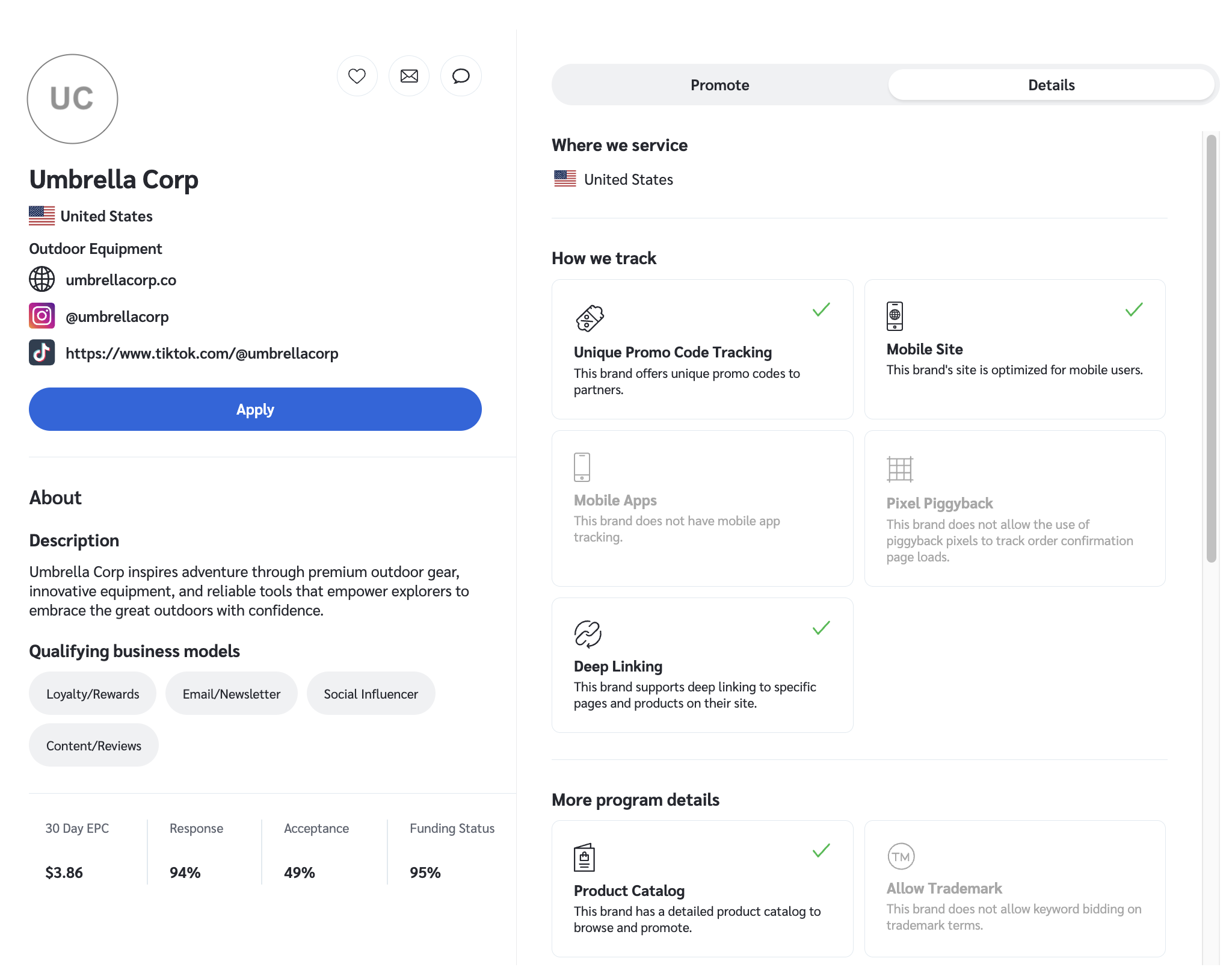 | **更多项目详情**  | <p>你在推广品牌时可能需要的其他信息：</p><p></p><p><strong>产品目录</strong></p><p>• 查看品牌是否已创建至少一个产品目录。</p><p>• 查看品牌是否已创建至少一个产品目录。</p><p></p><p><strong>允许商标</strong></p><p>• 你可以就品牌已注册商标的词语与其他合作伙伴竞价。这对 SEO 工作中的关键词设置很有用。</p><p>• 你可以就品牌已注册商标的词语与其他合作伙伴竞价。这对 SEO 工作中的关键词设置很有用。</p><p></p><p><strong>礼品卡支付</strong></p><p>• 品牌会根据消费者在结账时使用礼品卡进行支付。</p><p>• 品牌会根据消费者在结账时使用礼品卡进行支付。</p><p></p><p><strong>接受广告位</strong></p><p>• 品牌允许并愿意为广告位投放付费。</p><p>• 品牌允许并愿意为广告位投放付费。</p><p></p><p><strong>在 Amazon 上销售</strong></p><p>• 品牌的产品可在 Amazon 上购买。</p><p>• 品牌的产品可在 Amazon 上购买。</p><p></p><p><strong>接受网红合作</strong></p><p>• 品牌愿意与网红合作。</p><p>• 品牌愿意与网红合作。</p> |